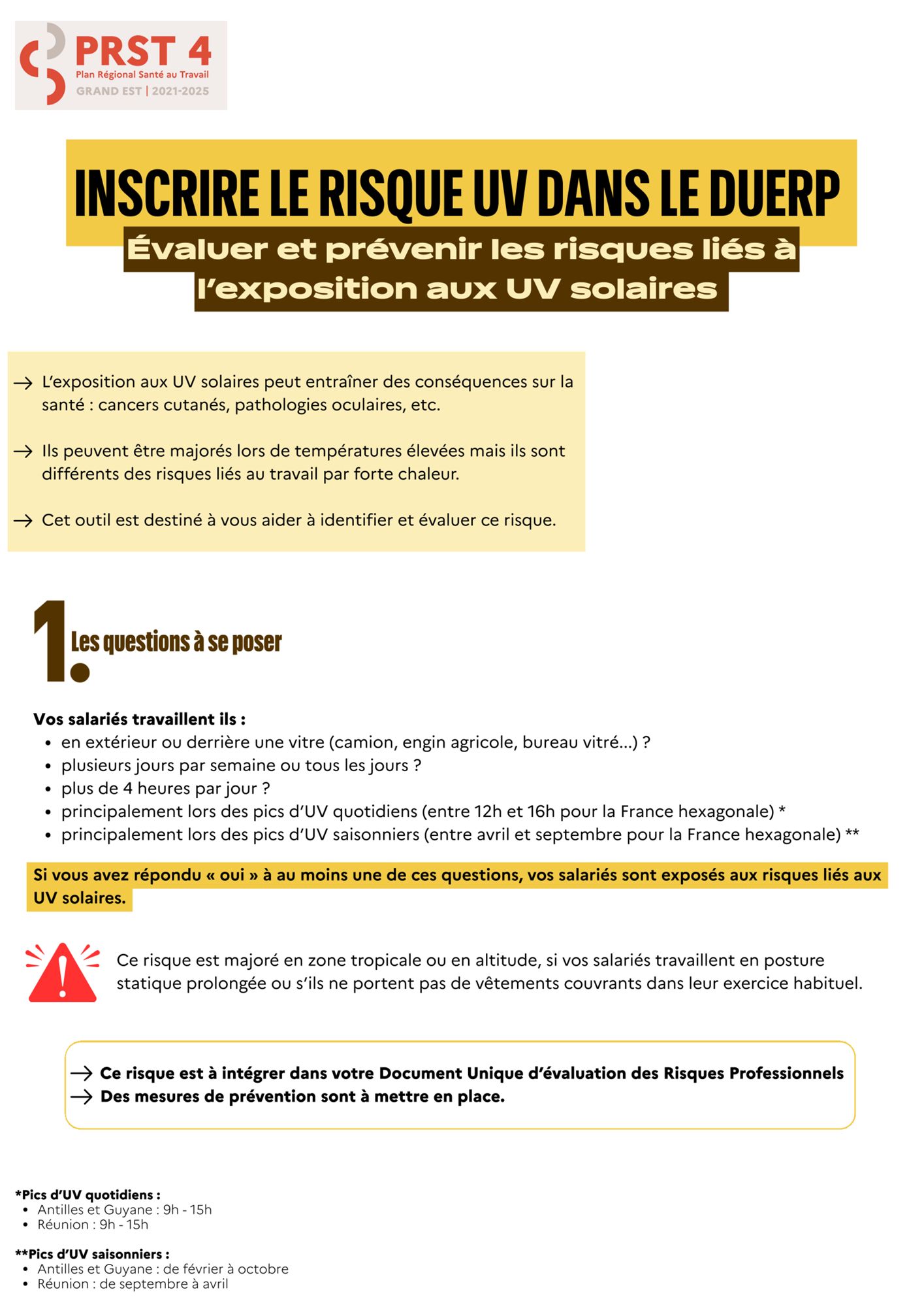 DOCUMENT UNIQUE D'EVALUATION DES RISQUES PROFESSIONNELS (DUERP) Webinaire : Employeurs, comment rendre votre DUERP plus efficace : prise en compte des RPS, du genre et de climat Présentation (10.6 Mo) Inscrire le risque UV dans le DUERP (121.1 Ko)
