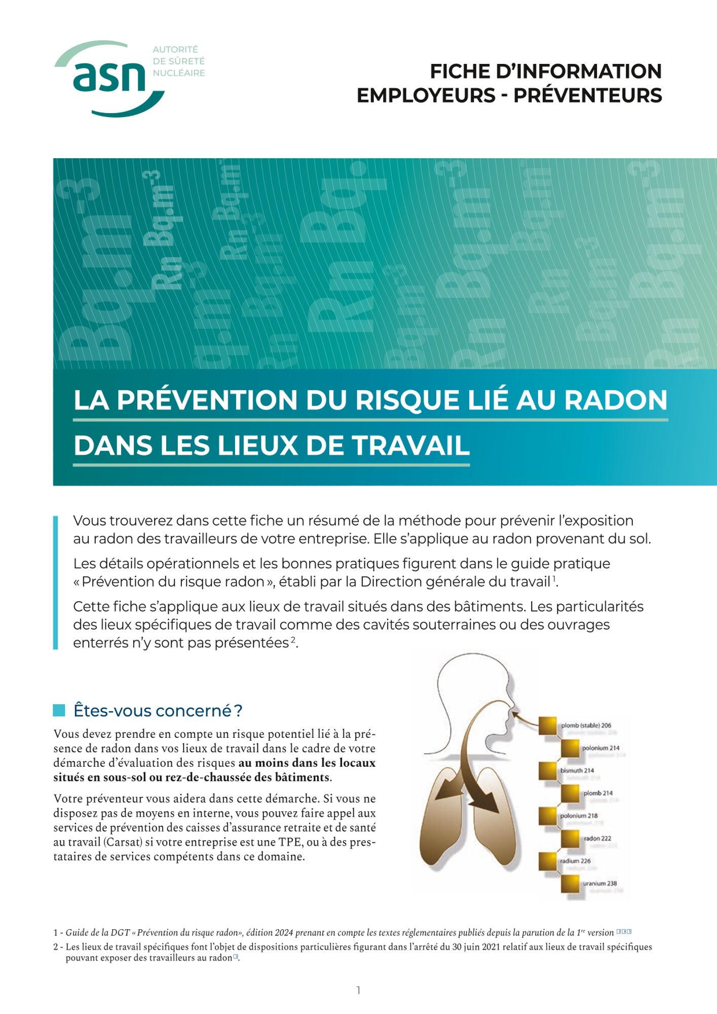 Le radon, gaz radioactif naturel, peut s’accumuler dans les bâtiments et les lieux de travail spécifiques (cavité souterraine…) et représenter un risque pour la santé des travailleurs. La réglementation impose aux employeurs d’évaluer et, si nécessaire, de réduire l’exposition au radon.