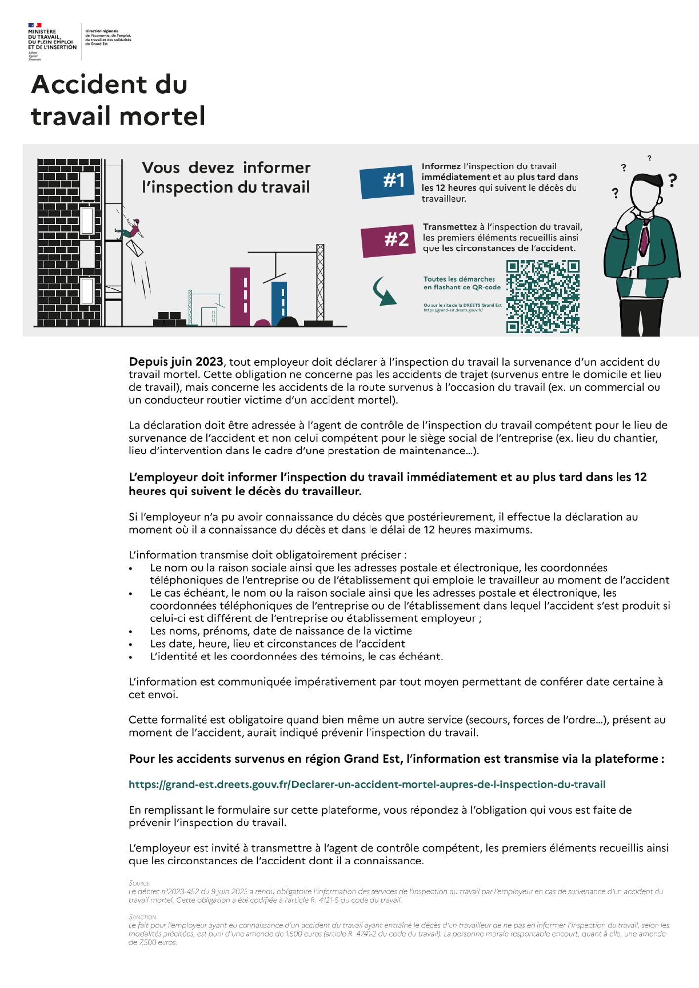Depuis juin 2023, les employeurs ont l'obligation de déclarer à l'Inpection du travail la survenance d'un accident du travail mortel. Cela ne concerne pas les accidents de trajet (domicile/lieu de travail)
