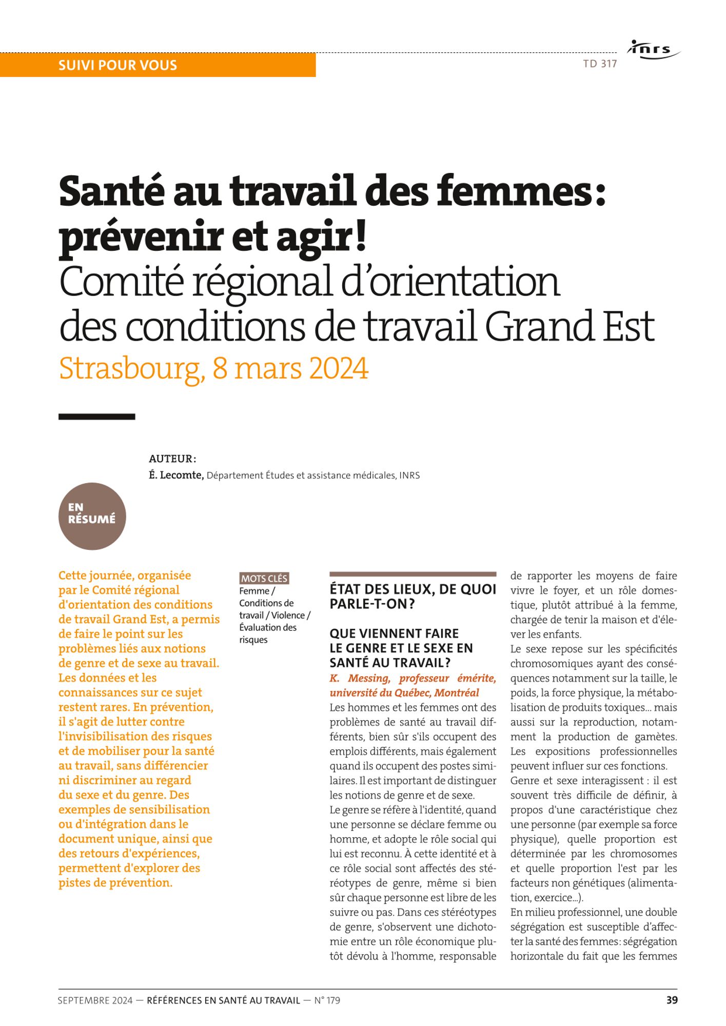 La journée du 8 mars 2024 organisée à STRASBOURG par le CROCT GRAND EST a été l'occasion d'approfondir les connaissances sur ces constats, de se rassembler, d'échanger, d'évoquer de nouvelles perspectives, dans l'objectif de contribuer à l'amélioration de sa santé au travail des femmes.