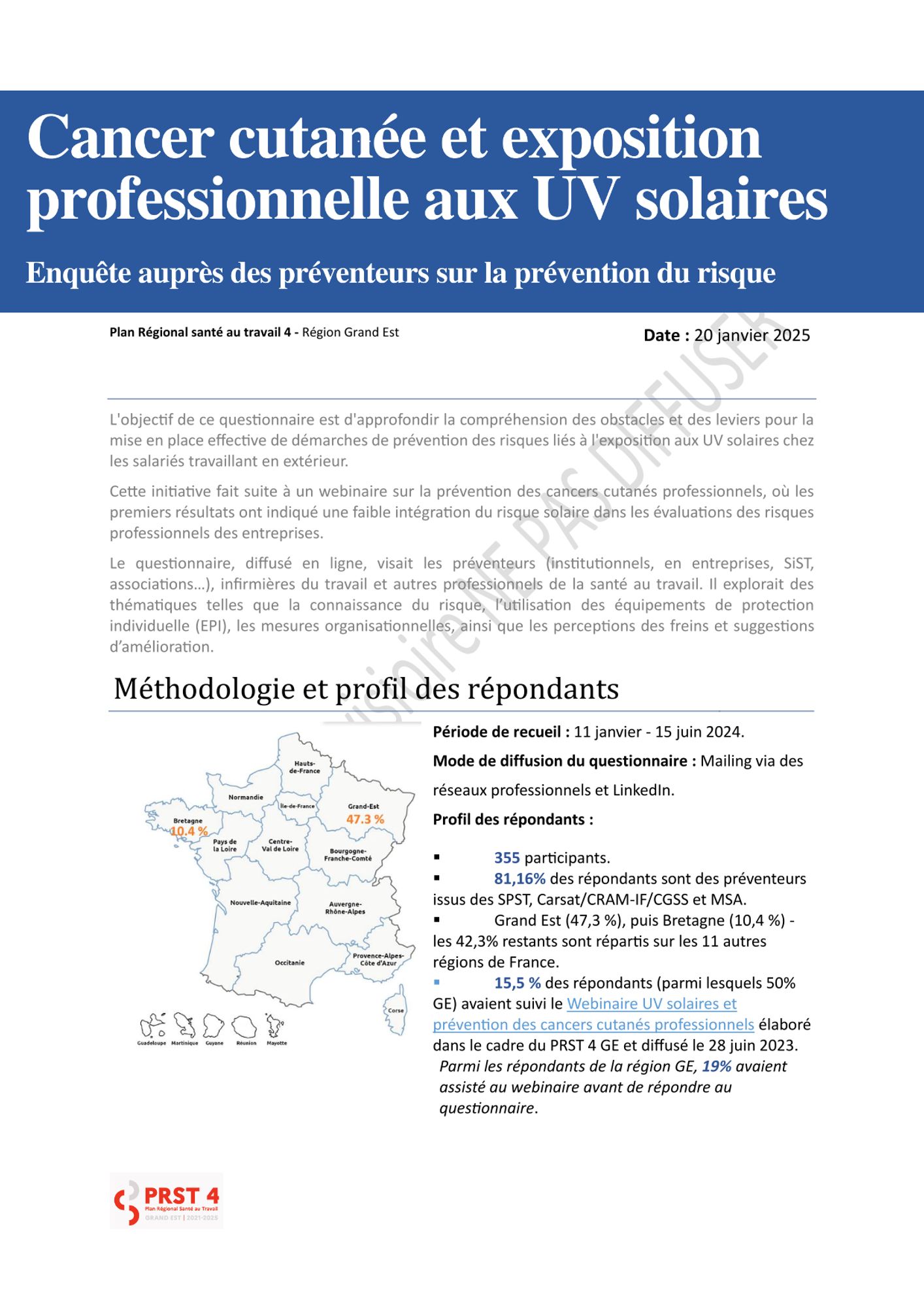 Dans le cadre des travaux du PRST du GRAND EST, le groupe de travail consacré à la prévention du cancer cutané lié aux UV solaires dans le cadre professionnel a mené deux enquêtes l'une auprès de professionnels de santé volontaires et l'autre auprès des préventeurs des risques professionnels, afin de mieux appréhender leur perception et connaissances sur ce risque, leurs pratiques et leurs besoins pour mieux le prendre en charge.
