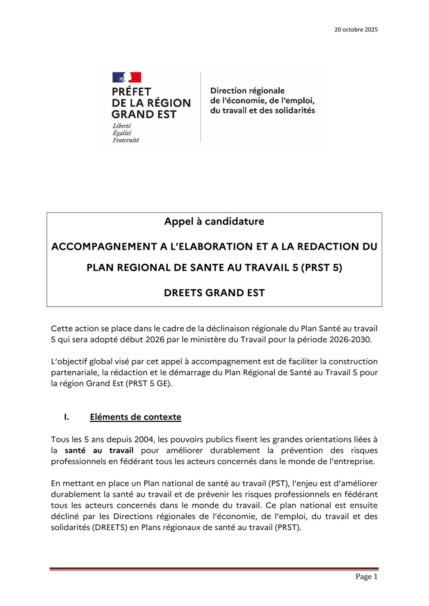 La Direction régionale de l’économie, de l’emploi, du travail et des solidarités (DREETS) Grand Est qui pilote la construction et la mise en œuvre de ce plan régional recherche un prestataire qui pourra l’accompagner dans cette démarche, en concertation avec le Comité Régional d’Orientation des Conditions de Travail (CROCT) et les acteurs de la santé au travail locaux, au cours de l’année 2026.