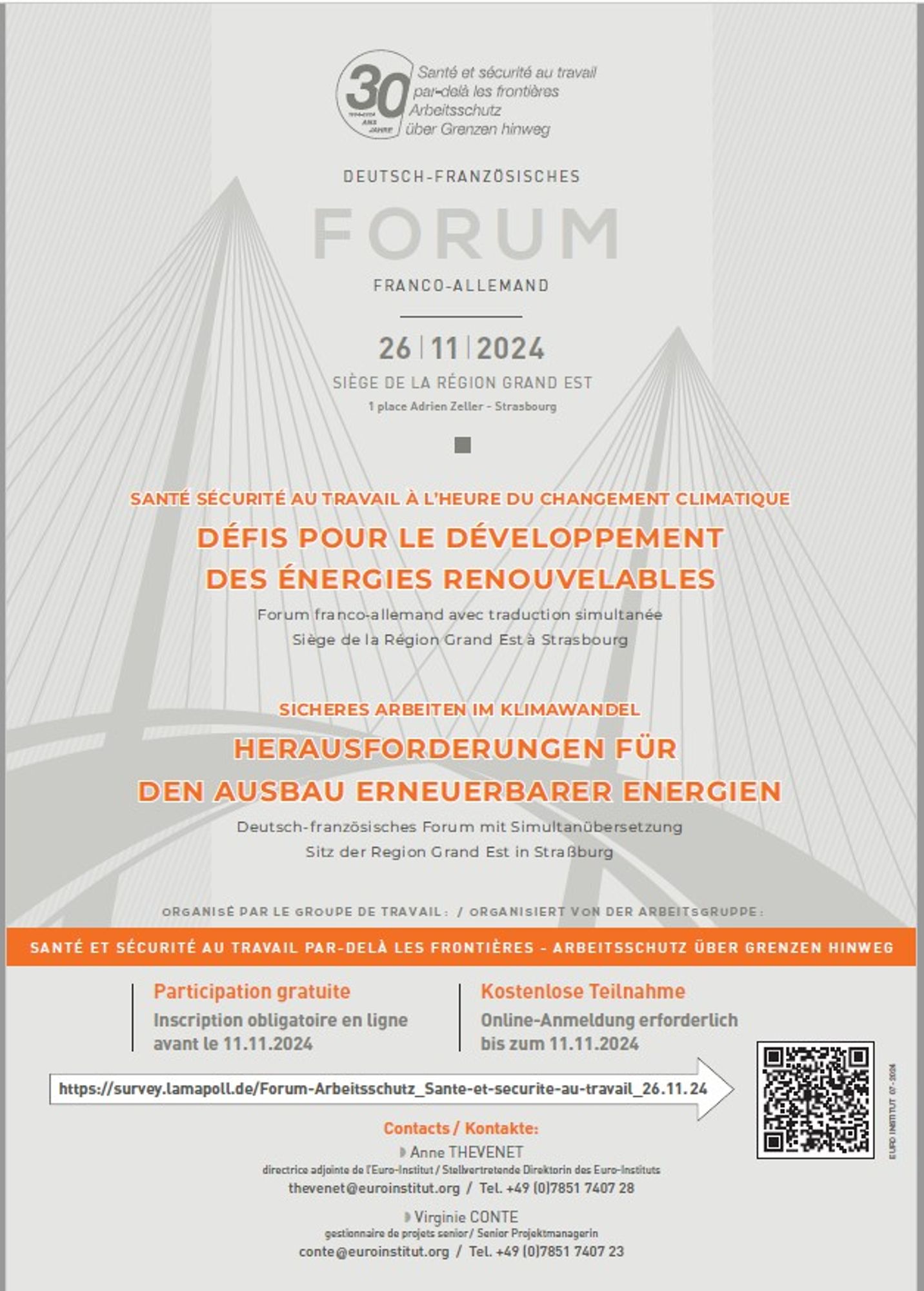 L’Euro-Institut et ses partenaires franco-allemands, dont la DREETS Grand Est, organisent le 26 novembre 2024 leur forum annuel sur la « Santé et sécurité au travail par-delà les frontières ».
