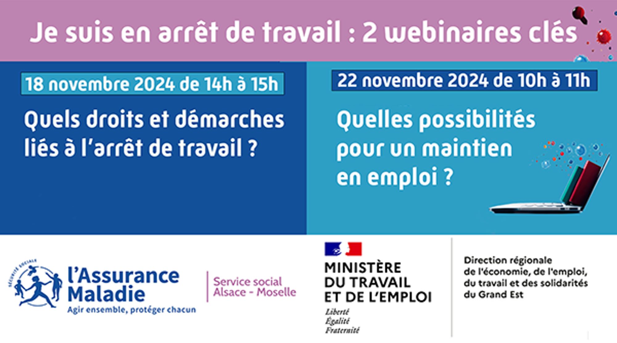 La Direction régionale de l’économie, de l’emploi, du travail et des solidarités Grand Est (DREETS) et le Service social de l’Assurance Maladie (service de la Carsat Alsace-Moselle) proposent, aux salariés du secteur privé, deux webinaires gratuits pour mieux connaître les démarches liées à l’arrêt de travail et les dispositifs de retour à l’emploi.