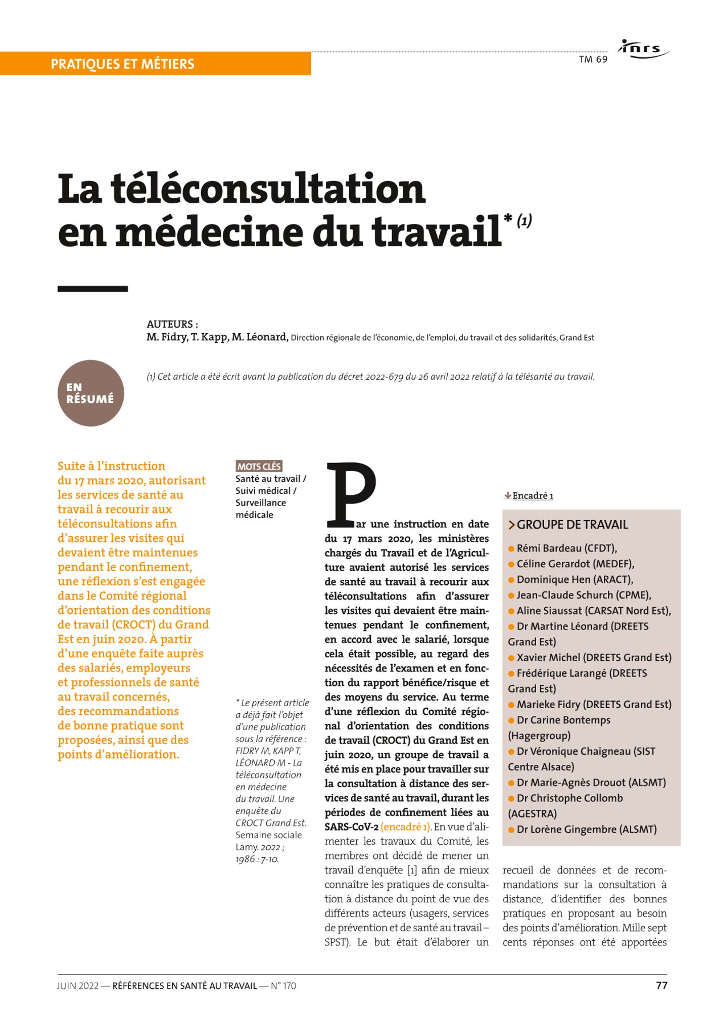 Téléconsultation La téléconsultation en médecine du travail (207.1 Ko) PRST GE : Regards croisés sur la consultation à distance en médecine du travail (1.7 Mo) La téléconsultation en médecine du travail (article Semaine sociale Lamy) (1.2 Mo)