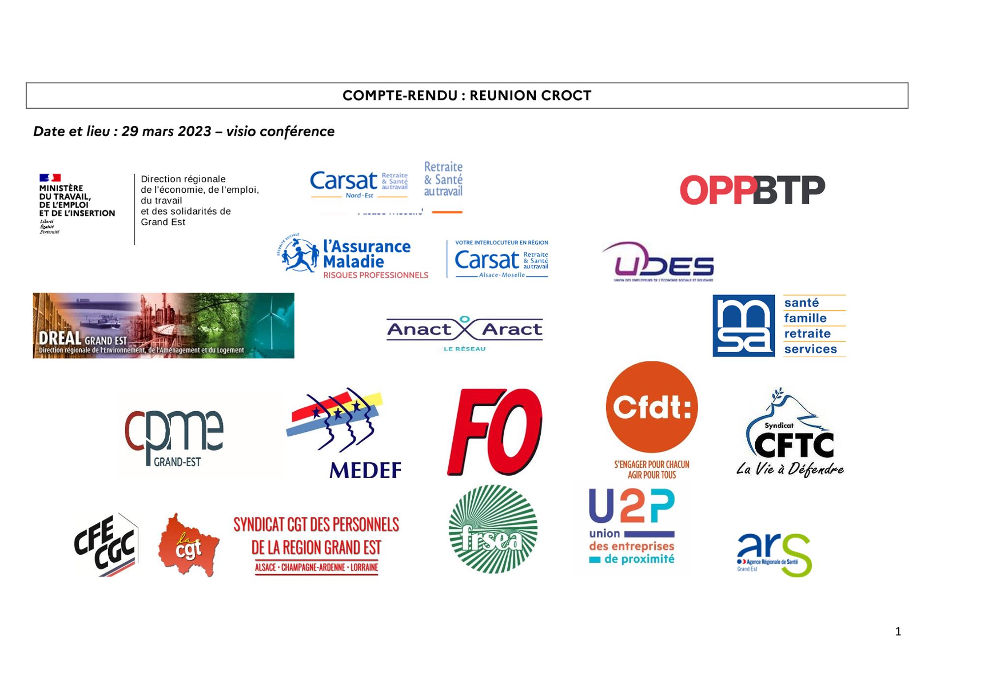 Comptes-rendus des réunions du CROCT et du CRPST CR réunion CROCT du 29.3.2023 (755.4 Ko) CR réunion CROCT du 14.6.2023 (836.3 Ko) CR de la réunion du CROCT du 20.9.2023 (875.6 Ko) CR de la réunion du CROCT du 13.12.2023 (966.0 Ko) CR de la réunion du CROCT du 20.3.2024 (702.8 Ko) CR de la réunion du CRPST du 1.2.2024 (169.1 Ko) Modalités d'application régionale du cahier des charges national d'agrément des Services de Prévention et de Santé au Travail du GRAND-EST CR de la réunion du CROCT du 19.6.2024 (370.3 Ko)